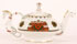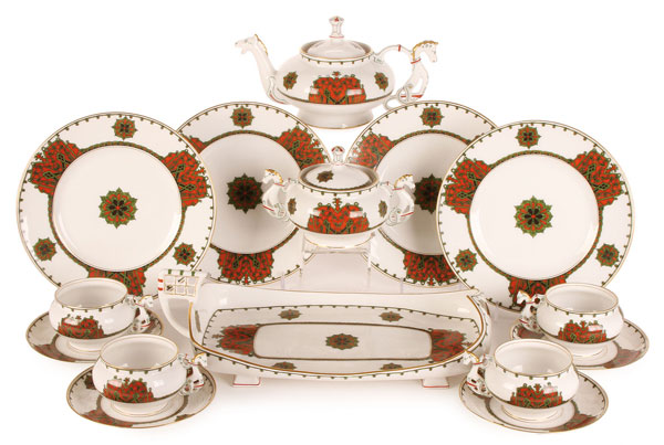 A RUSSIAN PORCELAIN TÊTE-À-TÊTE SERVICE, KORNILOV FACTORY, ST. PETERSBURG, 1903-1917. Comprising fifteen pieces, including a teapot and cover, sugar bowl and cover, a kovsh-form tray, four dessert plates, four cups and four saucers. Each decorated with strapwork, medallions and gold highlights. The handles and spout formed as horses. Underside of each piece marked with the Kornilov Bros. standing bear mark and model #131. The tray length 13 inches (33 cm), the dessert plates 8.1 inches (21 cm) diameter.