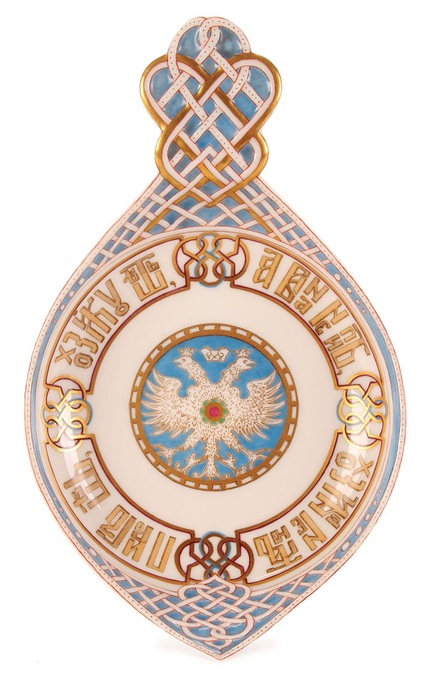 A FINE RUSSIAN PORCELAIN KOVSH, KORNILOV FACTORY, CIRCA 1900. Of traditional ancient form, the cavetto with gilt highlighted Imperial double-headed eagle surrounded with a gilt border inscribed with an old Russian proverb. The handles and rims with raised decoration of intertwining strapwork and gilt highlights. Cyrillic maker's mark beneath the Imperial Warrant. Length 7.75 inches (20 cm).