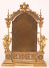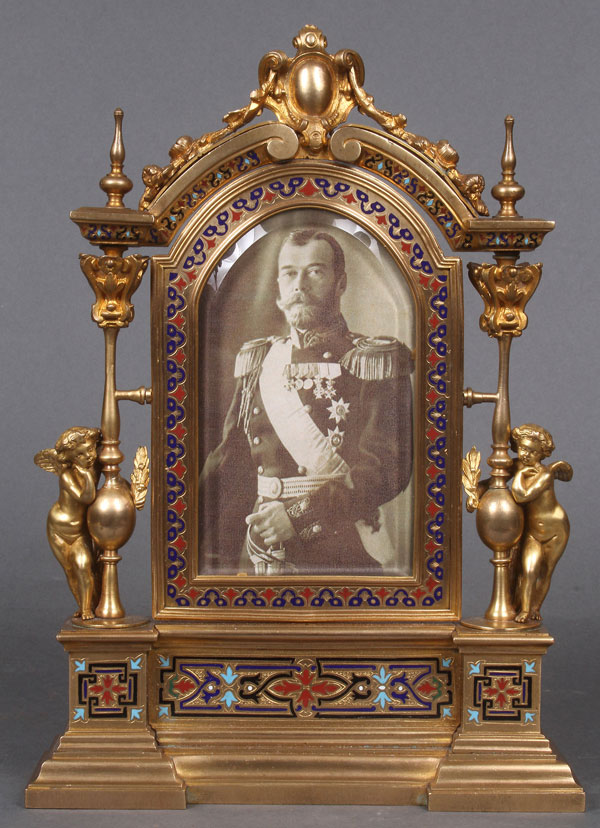 AN EXCEPTIONAL GILT BRONZE AND CHAMPLEVÉ ENAMEL FRAME, PROBABLY FRENCH, 19TH CENTURY. Resting on a multi-tiered rectangular base with champlevé enameled predella panel set with opposing winged cherubs holding palms and resting against spindle form columns with decorative capitals supporting an arched pediment with floral swags and crest finial above an arched frame with enameled border and beveled glass held in place by swivel supports. Height 11.5 inches (29.4 cm).