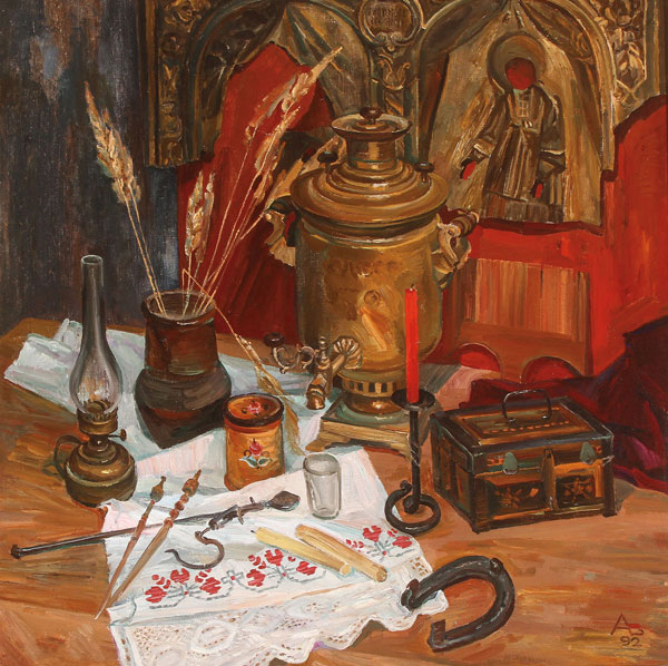 A RUSSIAN STILL LIFE PAINTING BY VLADIMIR MIKHAILOVICH ANANEV (RUSSIAN B. 1957- ). Oil on canvas, signed lower right and dated ’92, also inscribed on verso with title and date in Cyrillic. 40 inches x 40 inches (101.5 x 101.5 cm).