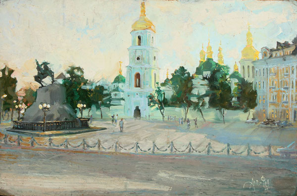 A RUSSIAN/UKRAINIAN SCHOOL PAINTING OF ST. MICHAELS GOLDEN-DOMED MONESTARY, KIEV, 2ND HALF 20TH CENTURY. Executed in oil on artist board, indistinguishably signed in abbreviated Cyrillic lower right, 15.75 x 23.75 inches (40 x 60 cm).