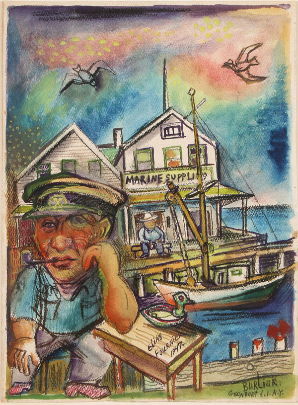 Signed lower right “Burliuk, Greenport, L.I. N.Y.”, and inscribed “Elias Fournier 1947”