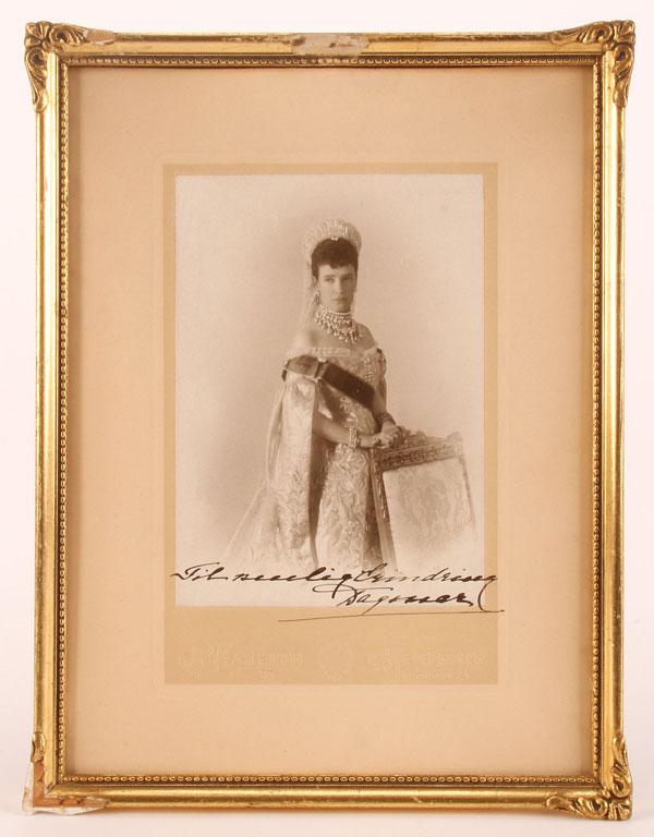 AN ORIGINAL SIGNED PHOTOGRAPH OF EMPRESS MARIA FEODOROVNA OF RUSSIA (1847-1928), ALFRED PASETTI, ST. PETERSBURG. Depicted here in court dress, a sharp image inscribed in Danish and signed "Dagmar." Mounted on custom cardstock, impressed in Russian "A. Pasetti" and St. Petersburg between the Imperial Warrant. The photo also impressed in Latin A. Pasetti. Image size 5.5 inches x 4 inches (14.2 x 10 cm); overall size of card 9 inches x 7 inches (23.5 x 17.5 cm).