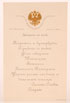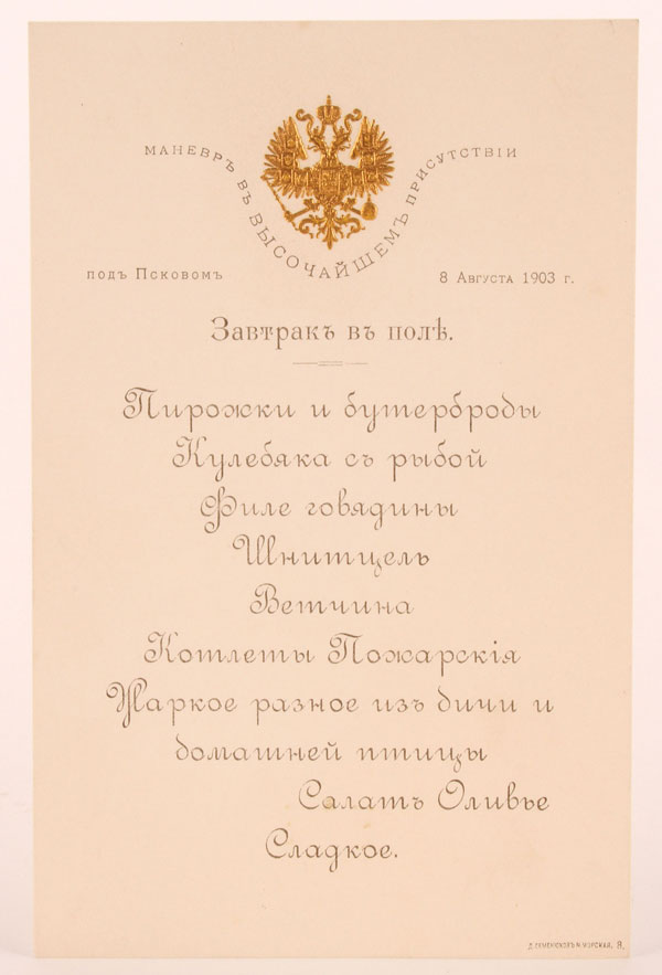 AN INTERESTING IMPERIAL RUSSIAN MENU, PSKOV, 1903. At top center a finely sculpted embossed gilt imperial double headed eagle atop the wrapped text, “Maneuvers in the Presence of the Emperor” and dated “Near Pskov, 8 August 1903." Below the menu for breakfast which consisted amongst other things, Fish, Filet mignon, Schnitzel, Ham, Meat Balls, Stew with Game and Birds, Salad Olivie and Sweets. Lower right corner imprinted with publishers name, D. Semeniukov, St. Petersburg. 6.75 inches x 4.4 inches (17 x 11 cm).