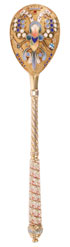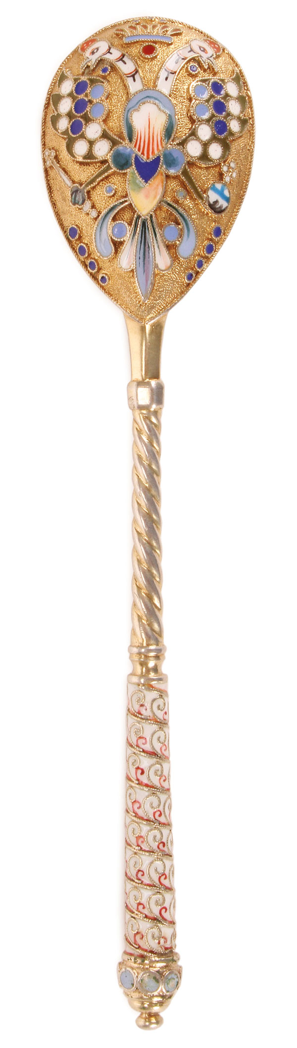A RUSSIAN SILVER-GILT, SHADED AND CLOISONNÉ ENAMELED SPOON, FEODOR RUCKERT, MOSCOW, 1899-1908. The almond shaped bowl with cloisonné and shaded Imperial double headed eagle beneath the royal crown at top, with twist stem shaded enameled handle and crown shaped finial. Hallmarked Moscow 1899-1908, Cyrillic maker's mark FR for Feodor Ruckert and 84 silver standard. Length 5.5 inches (14 cm).