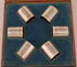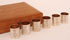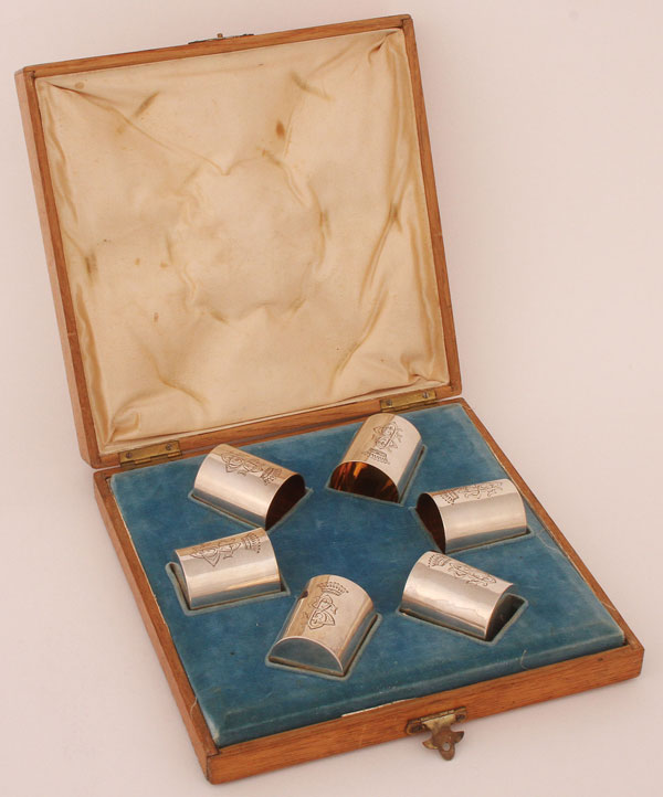 A RUSSIAN CASED SET OF SILVER VODKA GLASSES, MOROZOV, 1892. Comprising six polished silver glasses of slightly flaring cylindrical form, with gilded interiors and with engraved monogram beneath crown, contained in original custom fitted blue velvet and silk lined oak case. Stamped with the Cyrillic mark of V.MOROZOV, hallmarked St. Petersburg, dated 1892, and with 84 silver standard. Height of each glass 1.75 inches (4.1 cm).