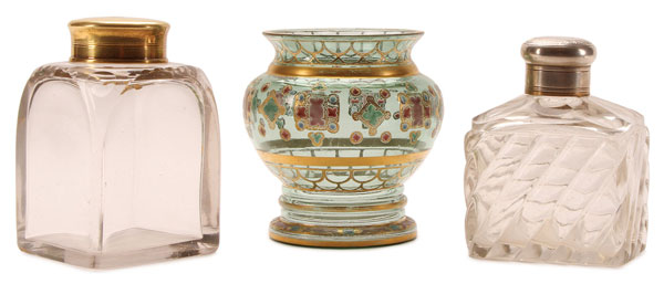 A GROUP OF THREE RUSSIAN IMPERIAL PERIOD GLASS ITEMS, CIRCA 1850-1915. Comprising a glass tea caddy with sloped and beveled shoulders, mounted with a silver-gilt overfitted cap, collar and stopper. Hallmarked Moscow, dated 1850 and Cyrillic maker's mark P.I. Height 5.1 inches (13 cm). Together with a swirled ribbed glass perfume with beveled shoulders mounted with a silver screw-on mushroom shaped cap and silver-gilt collar. Hallmarked St. Petersburg circa 1890 and Cyrillic maker's mark P OVCHINNIKOV next to the Imperial Warrant and 84 silver standard. Height 4.75 inches (12 cm). And a green glass bulbous vase with etched fish scale banding and enameled decoration, probably Dyat'kovo Crystal Works. Height 4.75 inches (12 cm).