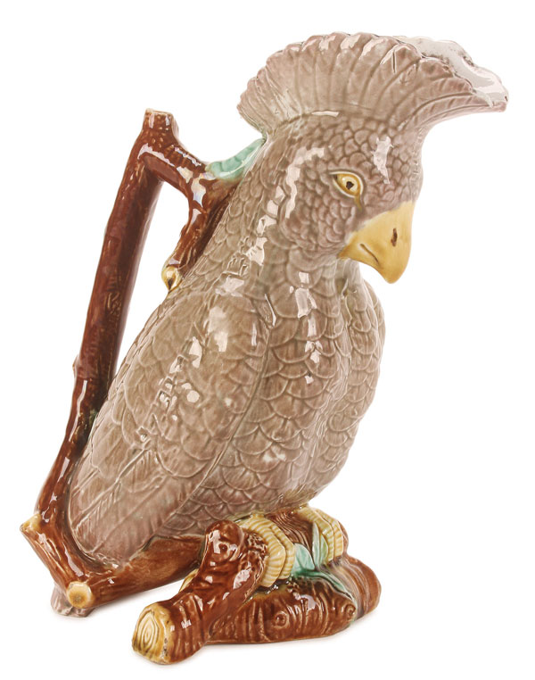 A SCARCE RUSSIAN MAJOLICA FIGURAL PITCHER, KUZNETSOV, CIRCA 1890. Molded in the form of a cockatoo resting on a branch, and with branch form applied handle. Underside impressed with the Cyrillic mark of M.S. Kuznetsov and mold number 136. Height 10.25 inches (26 cm).