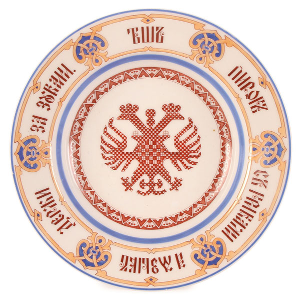 A RUSSIAN PORCELAIN PROVERBS BOWL, KORNILOV, CIRCA 1875. The central reserve with faux embroidered Imperial double headed eagle, the rim with strapwork and inscribed in Slavonic with a proverb. The underside of plate with blue factory mark of Kornilov under the Imperial Warrant. Diameter 9.5 inches (24 cm).