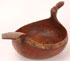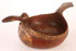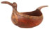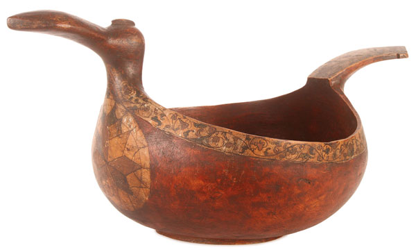 A LARGE AND IMPORTANT NORTH RUSSIAN CARVED AND POLYCHROME WOOD FIGURAL SKOPKAR, VOLOGDA PROVINCE, 18TH or 19TH CENTURY. Carved from a single piece of wood in the form of a resting bird, the prow carved as a head with beak and the handle in the form of spread tail feathers. The bowl deeply carved and resting on a slightly raised circular ring base and overall polychromed in red ochre, the rim banded in scrolling foliage and the handle similarly decorated; the breast with large star decorated circle medallion. Length 29 inches (73.5 cm), width 15 inches (38.4 cm).