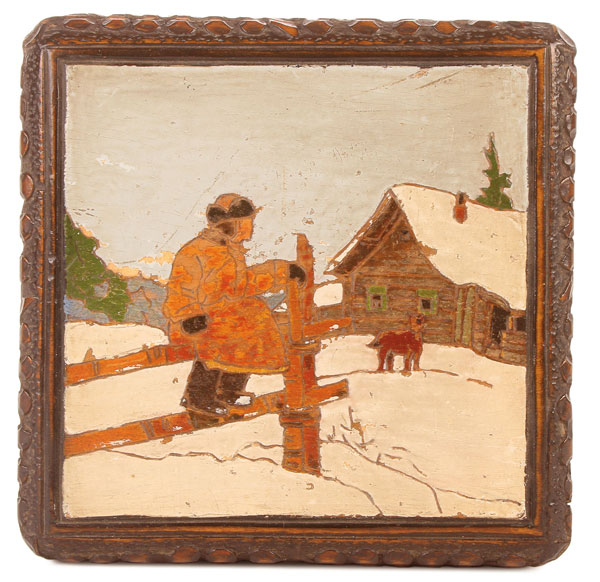 A RUSSIAN KUSTAR CARVED AND PAINTED DRESSER BOX, CIRCA 1920. With chip carved sides and the hinged lid with pyrogravure winter scene of young boy outside dacha, and also with original key. 6.25 square and 4.25 inches in height (16 x 11 cm).