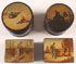 A GROUP OF FOUR RUSSIAN LACQUER TEA CADDIES, 19TH CENTURY. Comprising two barrel formed examples, one painted with a winter sledding scene, the other with a silhouette windmill scene, the underside of lid on both with Lukutin factory mark. Together with two rectangular examples with hinged lids, one painted with a courting scene, the other with a peasant girl resting on fence. One with Vishniakov mark, the other apparently unmarked. Greatest size 3.75 inches (9.8 cm).