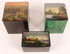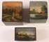 THREE RUSSIAN LACQUERWARE TEA CADDIES, 19TH CENTURY. Each with hinged lid depicted with bucolic landscape with peasant dwellings, one with the sides painted in faux malachite, two marked Vishniakov. Greatest size 5.1 inches (13 cm).