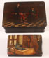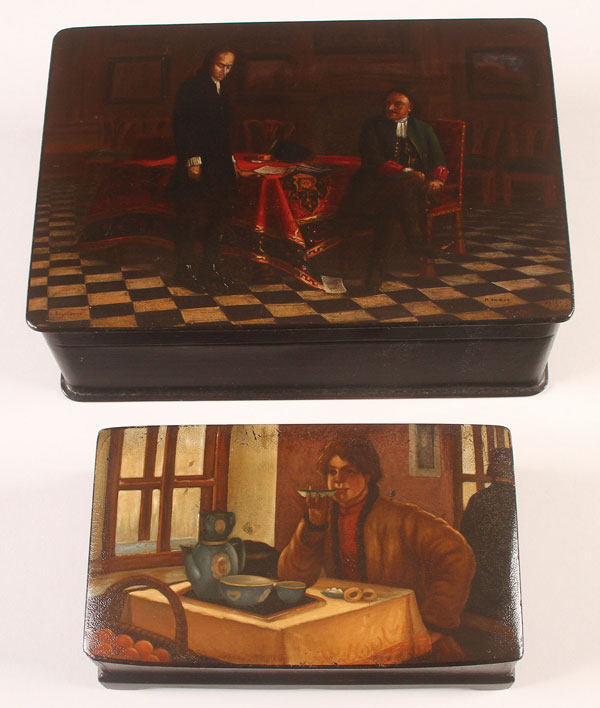 A PAIR OF RUSSIAN LACQUER BOXES, 19TH CENTURY. One painted with a scene of Peter the Great interrogating his son after the painting by Ge; the other with an interior scene of a young man drinking tea, the underside with Lukutin factory mark. Greatest length 8.75 inches (22 cm).