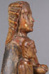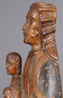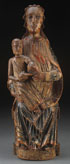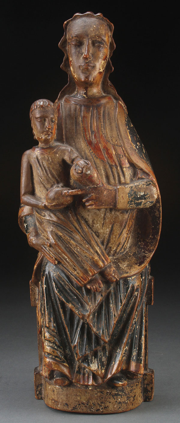 A FINE GOTHIC OR GOTHIC STYLE MADONNA AND CHILD CARVED AND POLYCHROME WOOD FIGURAL GROUPING, GERMAN. A highly stylized carved group, executed in three quarters round with deep angular folds and traces of original gilding and polychroming. The young Christ resting in the lap of the Virgin holding a pomegranate, the Virgin holding a heart. Height 16.6 inches (42.2 cm).