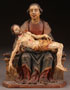 AN INTERESTING CARVED, POLYCHROME AND GILT WOOD FIGURAL GROUPING OF THE PIETA, GERMAN 18TH CENTURY. Carved in three quarters round, the crucified body of Christ finely sculpted, of good proportions and anatomy including veining, here reposed in the lap of the over-sized carved figure of the Virgin, resting on a padded bench. Retaining a good amount of the original polychroming, verso with old wax collector's seal. Height 8.75 inches (22.3 cm), width 6.8 inches (17.5 cm).