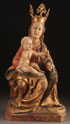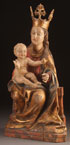 A CARVED, POLYCHROME AND GILT WOOD GOTHIC STYLE MADONNA AND CHILD FIGURE, GERMAN 19TH CENTURY. Finely carved in three quarters round, of good proportions, with deep folds and cascading hair. The infant Christ holding an apple and seated upon his mother's lap, who wears a large crown with carved gothic arches. Some minor worming and losses. Height 25.5 inches (65 cm).