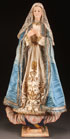 A LARGE AND IMPRESSIVE CARVED AND POLYCHROME FIGURE OF THE IMMACULATE CONCEPTION, SPANISH 19TH CENTURY. The feet, hands and head realistically carved, the head set with glass eyes and earrings, dressed in an ornately embroidered silk gown with bullion fringe and the front embroidered with the interlocking abbreviation AM beneath a crown, the blue silk robe profusely decorated with silver embroidered fringe, and the head set with a lace mantilla. Resting on a carved and polychrome wooden base in the model of a globe surrounded by clouds, and beneath her feet a serpent. Overall height 38.5 inches (97.5 cm).