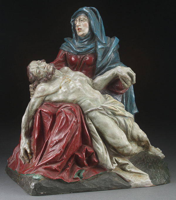 A GOTHIC STYLE CARVED AND POLYCHROME FIGURAL GROUPING OF THE PIETA, GERMAN 19TH CENTURY. Sensitively carved in full round with good proportions and anatomy, retaining a good amount of original paint. Height 16.5 inches (42 cm).