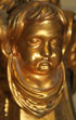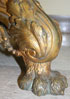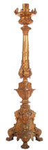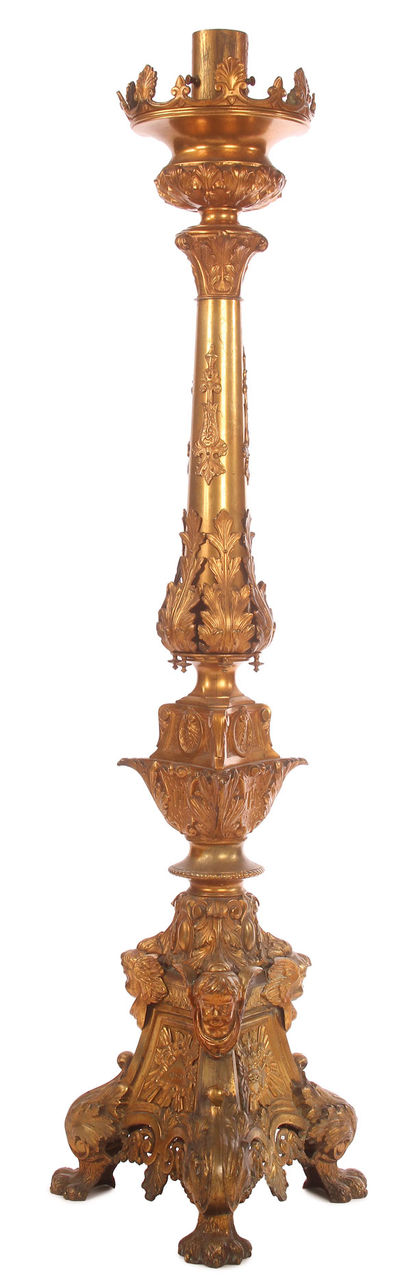 A LARGE AND ORNATE GILT BRONZE PASCHAL CANDLE STAND, 19TH CENTURY. The ornate three sided base resting on furry paw feet, each side with cartouche displaying sculpted symbols in high relief; the Agnus Dei, the Sacred Heart and Immaculate Heart, and the Tetragrammaton. The corners set with finely sculpted winged cherub upon which rests a rising ornate tapering column with acanthus overlay supporting a double tiered Corinthian style capital with large overhanging drip pan with scalloped rim. Height 70.25 inches (178.5 cm).
