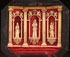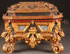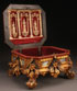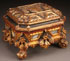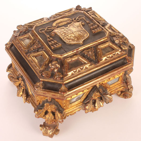 AN ORNATE CARVED GILT WOOD CASKET, VENETIAN, 18TH OR 19TH CENTURY. Resting on four carved and gilt scrolled bracket feet, the sides with carved rosettes and leaves, and further inset with mirror tiles. The hinged lid similarly carved and decorated, and at center a relief carved coat of arms of a Cardinal. The underside of lid decorated with carved bone figures of saints, each within an arched reserve flanked by fluted columns, surmounted with classical figures and below, winged putti. With original key. Height 8.5 inches (21.5 cm), depth 11.5 inches (29 cm), width 12.75 inches (32.5 cm).