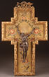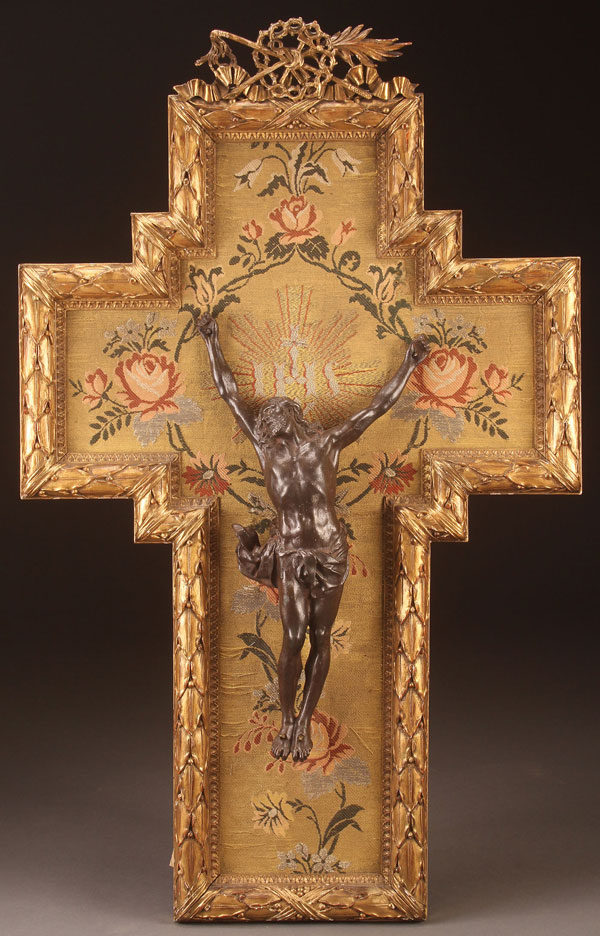 A LARGE AND IMPRESSIVE CARVED AND GILT WOOD CROSS FORM FRAME, FRENCH 19TH CENTURY. The border carved with ribbon tied acanthus and the inner border with palmettos, the top surmounted with a finely pierced carved composition displaying the implements of the Passion. The interior lined with embroidered fabric and set with a finely sculpted cast iron Corpus Christi. Overall height 38 inches (96.5 cm), width 23.8 inches (60.5 cm).