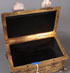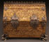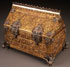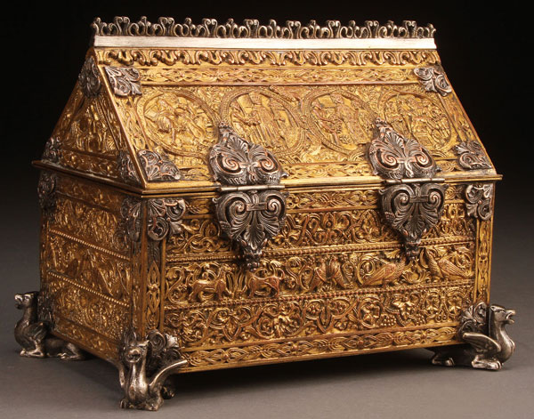 AN ORNATE GILT BRONZE AND SILVERED CASKET IN THE LATE BYZANTINE STYLE, 20TH CENTURY. Resting on four winged griffin feet at each corner. The sides decorated in ornate relief strapwork and scrolling foliage amidst birds and animals. The hinged lid of gabled roof form decorated with four detailed relief sculpted scenes set within medallions encircled with rope border and amidst animals. The lid with decorative hinged latch elements and the ridge of roof mounted with decorative crest molding. The interior lined in velvet. Length 9 inches, width 5.75 inches, height 7 inches (23 x 14.5 x 17.8 cm).
