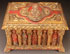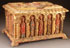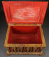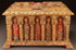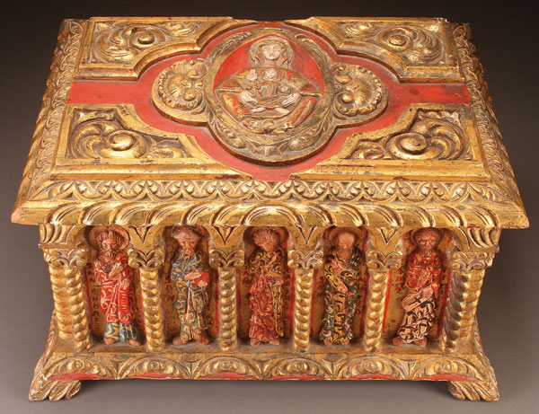 A LARGE AND IMPRESSIVE CARVED, POLYCHROME AND GILT WOOD CHEST IN THE ROMANESQUE STYLE, PROBABLY SPANISH 20TH CENTURY. Resting on four carved feet, the overhanging base carved with floral forms and the sides carved with arched reserves separated by twist carved columns and each set with a polychromed relief sculpted figure of a saint. The large carved hinged lid faced with quatrefoil carved relief center medallion depicting the Madonna and Child, opening to reveal the interior finished in red polychroming. Width 27.5 inches (70 cm), height 16.25 inches (41 cm), depth 21 inches (53.5 cm).