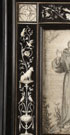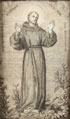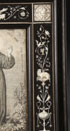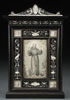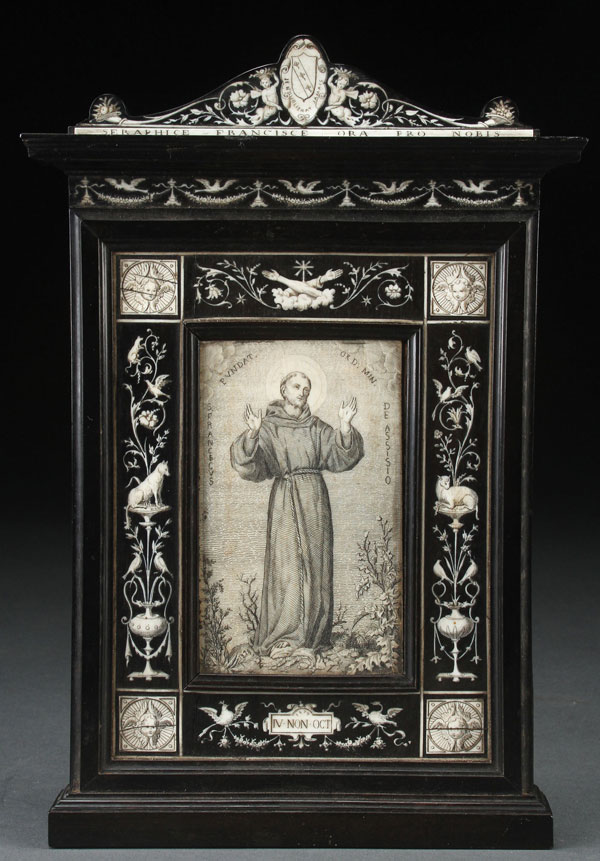 AN ITALIAN EBONY AND INLAID IVORY FRAME AND ENGRAVED PLAQUE, DATED 1879. At center held within a rectangular reserve, a finely scrimshawed ivory plaque depicting Saint Francis of Assisi signed with monogram and dated 1879 and surrounded with a border of engraved inlaid ivory depicting on the sides birds and animals amidst scrolling foliage and flowers. The corners set with winged cherub heads and immediately above the image of St. Francis the inlaid symbol of St. Francis’ conformity with Christ - both his and the arm of Christ crossed beneath a crucifix. Below the image of Francis, inlaid and engraved ivory birds holding a banner aloft inscribed 4th of October 1879 (October 4th being the Feast Day of St. Francis). Beneath the overhanging arched pediment at top a row of inlaid garlands interspersed with doves and above a coat of arms displaying fleur-de-lis and in French inscribed Je N'oublie Jamais and below in Latin Seraphice Francisce Ora Pro Nobis – Saraphic Francis Pray for Us. The verso with inlaid ivory plaque inscribed M. Zuccareeli, ROMA VIA LAURINA 24 and with hinged strut stand. Height 9.5 inches (24cm) width 6.5 inches (16.5cm).