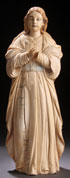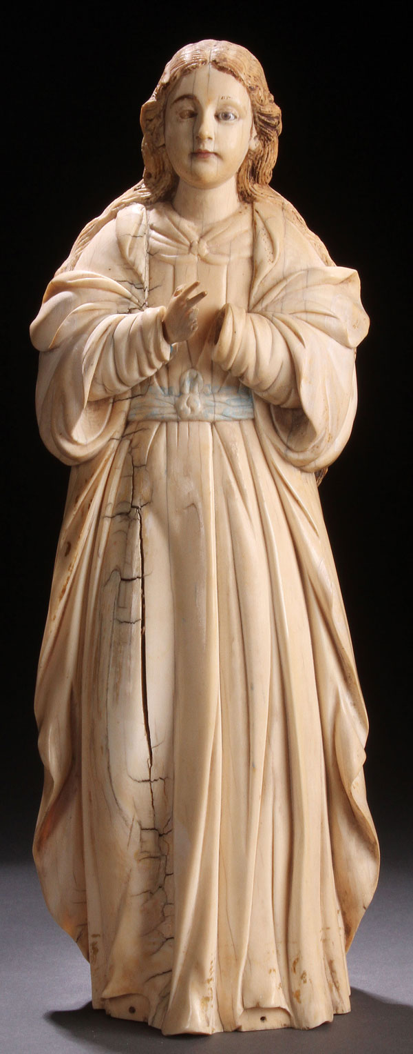 A LARGE AND IMPOSING CARVED IVORY FIGURE OF THE IMMACULATE CONCEPTION, HISPANO-PHILIPPINE, 18TH CENTURY. Carved in full round with deep folds and cascading hair covering the entire back of the figure and the head with glass eye. Some traces of original polychrome present and with losses. Height 13.25 inches (33.5cm).