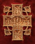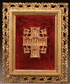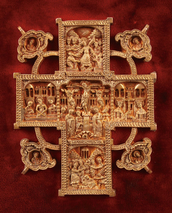 AN INTERESTING AND FINELY CRAFTED GILT BRONZE ORTHODOX CROSS FORM PLAQUE, 19TH CENTURY. Finely sculpted in high relief, at center the crucifixion and on the left cross terminal the Placement in the Tomb, on the right Saints Constantine and Helen. At the top terminal the Descent into Hades and on the base The Raising of Lazarus. At the outside corners within decorative floral forms the Four Evangelists. Set on a velvet-covered support and mounted in a gilded frame. Likely modeled on a carved boxwood cross of the type produced on Mt. Athos. Height 4.75 inches (12 cm).