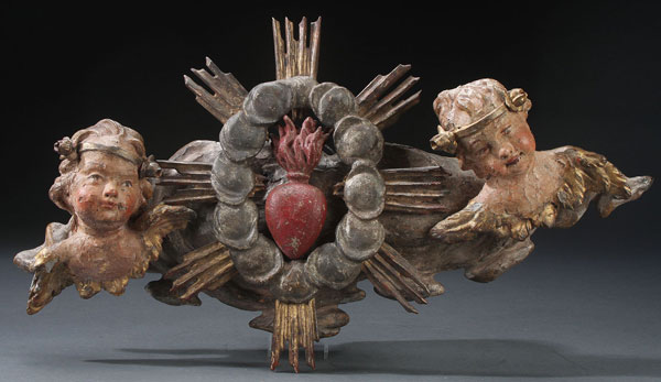 A POLYCHROME AND GILT WOOD CARVED RELIEF PLAQUE OF THE SACRED HEART, GERMAN, 18TH CENTURY. Carved in high relief, the background foundation sculpted as billowing silver leafed clouds, set at center with a carved red flaming heart encircled with clouds and emitting carved gilt rays. The ends set with finely carved winged putti. Width 21 inches (53.5 cm), height 11.75 inches (30 cm).