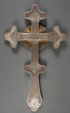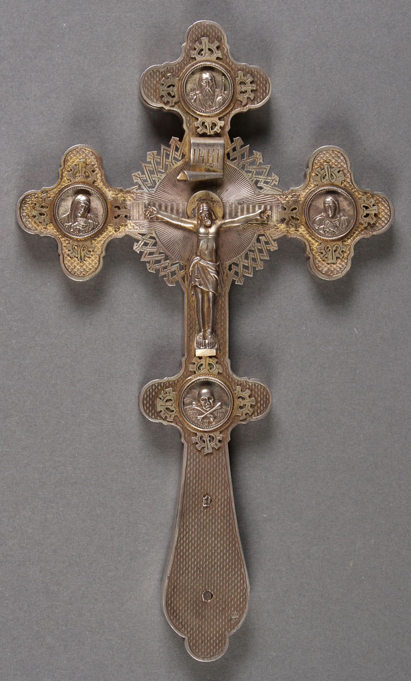 A RUSSIAN SILVER-GILT AND ENGRAVED ALTAR CROSS, CIRCA 1900. Hallmarked Moscow 1899-1908, Cyrillic maker's mark P.I. Length 10.75" (27.5 cm). Losses.