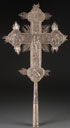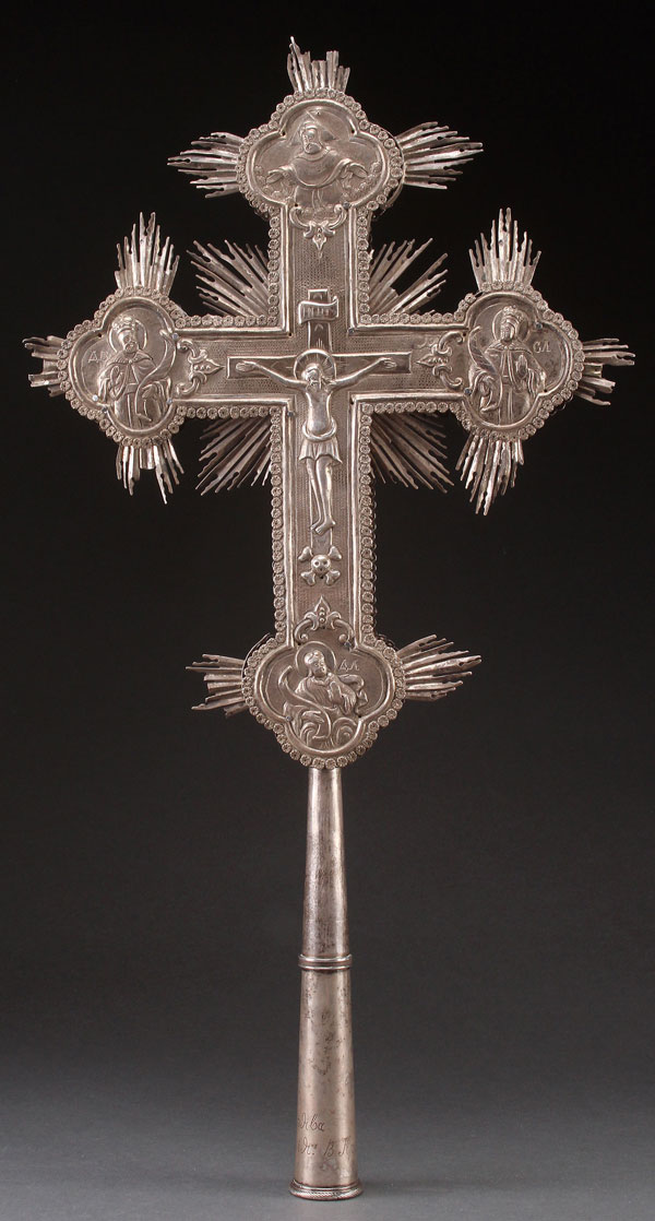 A LARGE SILVER PLATED AND REPOUSSÉ PROCESSIONAL CROSS, PROBABLY ARMENIAN, 19TH CENTURY. Engraved & dated 1886. Overall Ht. 26 inches (66 cm).