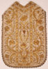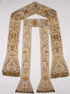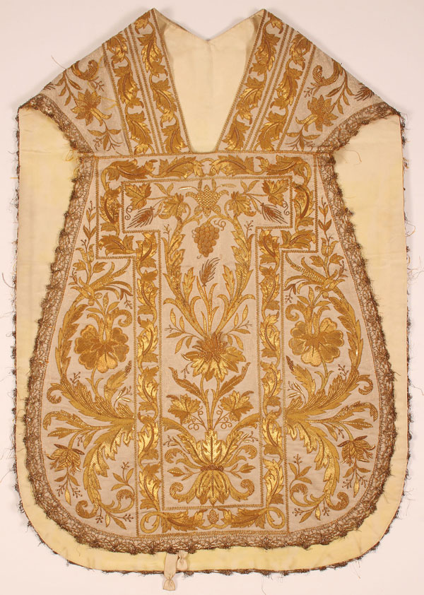 A VERY FINE ITALIAN BULLION AND SILK EMBROIDERED VESTMENTS SET, WORKSHOP OF GIOVANNI ROMANINI, 19TH CENTURY. Comprising an exceptional bullion embroidered chasuble, overall embroidered with scrolling foliage and grapevine motifs, worked in bullion and silver thread, and with the label G. Romanini, Roma. Together with a similarly embroidered chalice cover and two stoles. Chasuble 42 inches (107 cm) x 29.25 inches (74 cm).