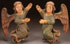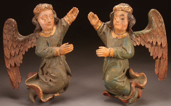 A PAIR OF CARVED AND POLYCHROME WOOD ANGELS, SOUTH GERMAN, PROBABLY 18TH CENTURY. Carved in half round in high relief and retaining some of the original polychrome and gilt as well as later retouching. Height 19.25 inches (49 cm) each.