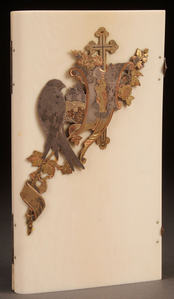 A FINE IVORY MOUNTED SPANISH PRAYER BOOK, CIRCA 1890. Being the El Oficio del Domingo –The Sunday Office, prayers and exercises to assist the Sacrifice of the Mass, Vespers etc… Tournai, Belgium, by the Society of Saint John the Evangelist. Gilt tipped pages with ivory covers and silver plated latches. The front cover set with an ornate engraved silver and gold plated copper plaque depicting a cross mounted religious banner emblazoned with an image of the Virgin and Child amidst flowers and a swallow. Length 6.25 (16 cm).