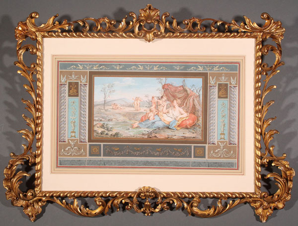 TOMASSO BIGATTI (ITALIAN 18TH/19TH CENTURY), A DESIGN FOR A WALL DECORATION IN THE ANCIENT ROMAN STYLE. The central scene depicting Venus and Cupid, flanked by panels with putti, dolphins, birds, swags and garlands. Watercolor and gouache on vellum. Image size 11.75 inches x 20 inches (29.8 x 50.8 cm), contained in an ornate, carved and gilt glazed wood frame, as illustrated.