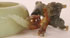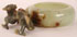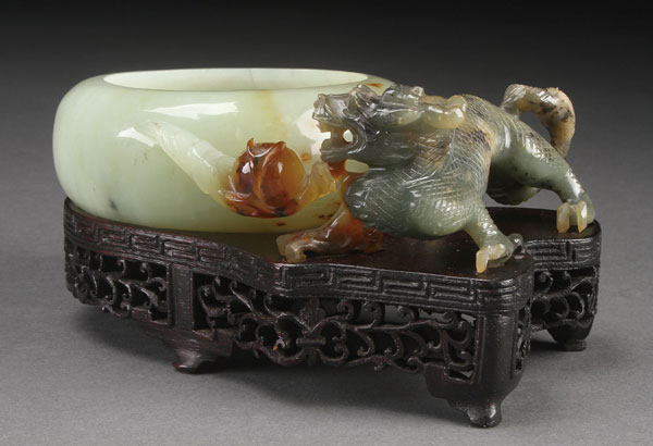 AN EXTREMELY FINE CHINESE CARVED CELADON, RUSSET AND GREEN JADE DRAGON WATER COUPE, QING DYNASTY. Finely carved and modeled with a figural handle of a dragon in greenish/gray jade shading to russet and further shading to celadon in a the form of a well hollowed circular bowl with inverted rim. Raised on a fitted pierced carved scroll hardwood stand. Jade length 6 inches (15.3 cm).