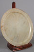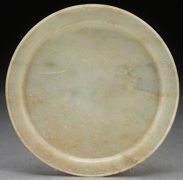 A FINE CHINESE CARVED CELADON JADE SHALLOW DISH, QING DYNASTY. Of circular form, with slightly everted flat rim and raised on a short footrim, in semi-translucent celadon colored jade with scattered russet highlights. Diameter 6.5 inches (16.5 cm), depth .375 inches (1.1 cm).