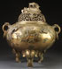A LARGE AND IMPRESSIVE CHINESE BRONZE CENSER, 19TH OR 20TH CENTURY, POSSIBLY FROM A SHRINE. Sculpted with phoenixes, florals, and Buddhist symbols, raised on three elephant form legs. The reticulated cover surmounted with a figural elephant and ruyi head finial. The base with embossed seal mark. Height 21 inches (53.5 cm).