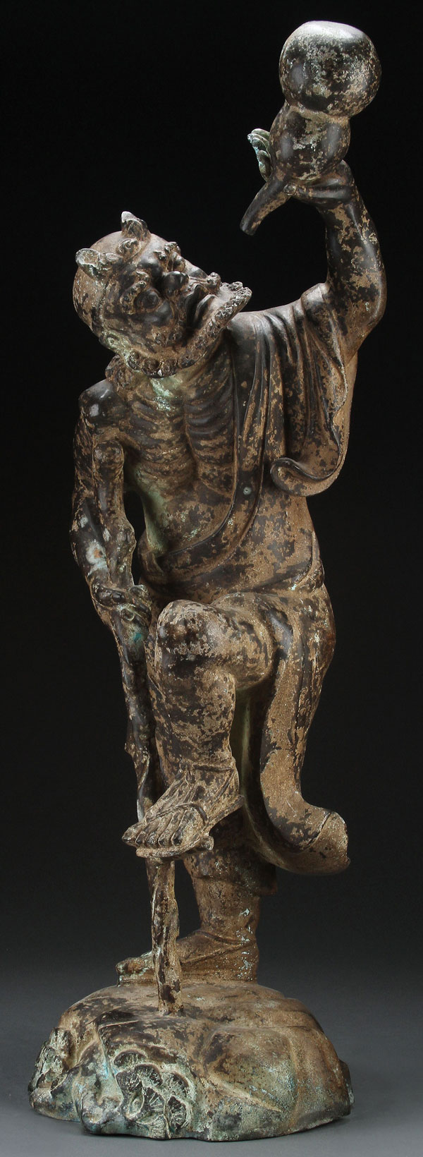 A LARGE CHINESE BRONZE FIGURE OF AN IMMORTAL, 19TH/20TH CENTURY. Depicting an emaciated figure with crutch and double gourd vessel. The exterior with considerable encrustation and oxidation. Height 30.75 inches (78 cm).