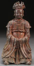 A CHINESE BRONZE FIGURE OF CONFUCIUS, QING DYNASTY, PERHAPS EARLIER. Depicted in seated form with hands in sleeves, nice patina with traces of pigment. Height 7 inches (18 cm).