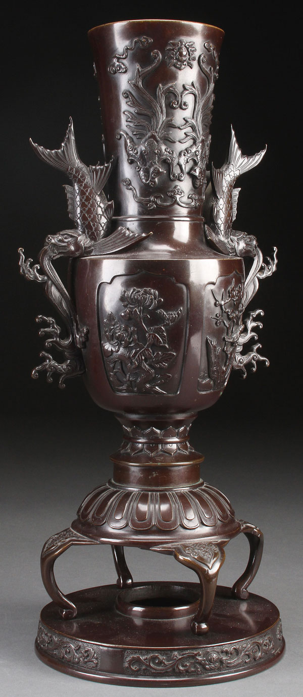 A JAPANESE BRONZE URSABATA, 20TH CENTURY. Of handled baluster form with embossed floral panels, raised on four legs, under a dark brown patina. Height 18 inches (46 cm).
