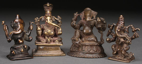 A GROUP OF FOUR SINO-TIBETAN TRAVELING BRONZE FIGURES OF GANESH, MOSTLY 18TH AND 19TH CENTURY. Including a gilt bronze figure and a seated figure on a lotus throne which is perhaps an earlier piece. Largest height 2.5 inches (6.3 cm).