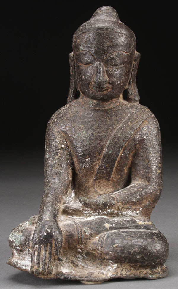A BURMESE CAST IRON SEATED BUDDHA, POSSIBLY SWEBO PERIOD. Depicted with hands in bhumisparsa mudra, with closed eyes and peaceful expression. Height 8.5 inches (21.5 cm).
