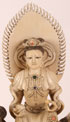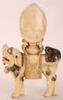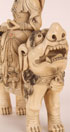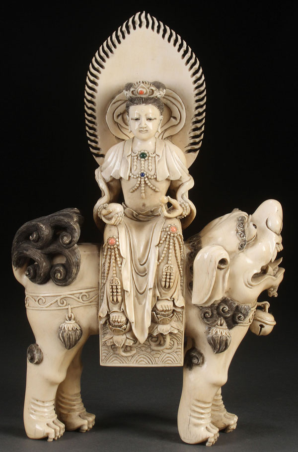 A VERY FINE CARVED IVORY AND JEWELED FIGURE OF KWAN YIN, QING DYNASTY. The expertly carved figure of Kwan Yin with flaming halo and adorned with inlaid coral, malachite and blue jasper jewels with feet resting on lotus blossoms seated atop a fully carved foo lion with inset tiger eye pupils. Height 12.25 inches (31 cm).