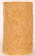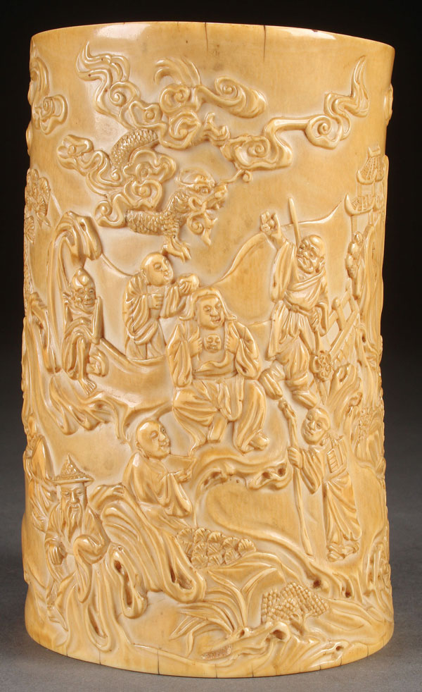A VERY FINE CHINESE CARVED IVORY SCENIC BRUSH POT, PROBABLY EARLY QING DYNASTY. Fully carved in the round with a complex relief scene of figures and immortals in a mountainous setting decorated with waterfalls, pine trees, dragons, pavilions and cloud forms. Height 5.625 inches (14.3 cm).