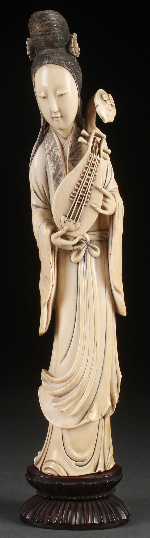 A FINE CHINESE CARVED IVORY FIGURE, QING DYNASTY. In the form of a standing young beauty with shaped coiffure, holding a mandolin with ruyi head ornament. Traces of early polychrome. Raised on a carved double lotus rosewood stand. Height of ivory 12.5 inches (31.8 cm). Overall height 14 inches (35.5 cm).
