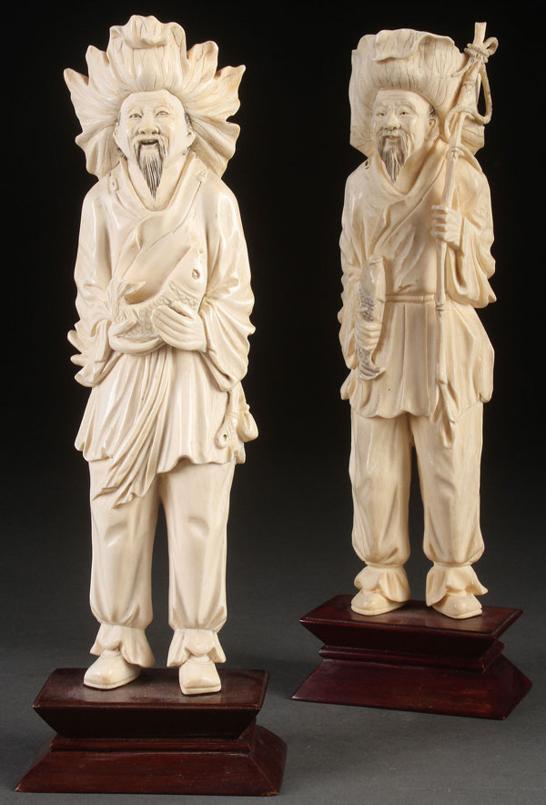 A PAIR OF JAPANESE CARVED IVORY OKIMONOS, MEIJI PERIOD. Each depicting a bearded fisherman with catch and wearing lily pad head pieces. Height of ivory 9 inches (23 cm). Raised on rectangular hardwood plinths. Overall height 10.25 inches (26 cm).